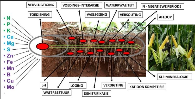 Die gespesialiseerde Kynoch korrel (Ultra Reeks) en vloeibare (Opti en Auquatech) reekse is een van die bestuurs strategieë wat ‘n produsent kan gebruik om meer effektief te wees met voeding, asook om verliese te verlaag en beperk. Voedingselemente essensieel vir optimale gewas produksie word blootgestel aan verliese wat plaasvind in die grond. Verliese soos vervlugtiging, loging en vaslegging net om ‘n paar te noem, verlaag die doeltreffendheid van kunsmis drasties. Die grondchemiese en -fisiese eienskappe wat so ‘n groot rol speel, word in ag geneem met die formulering van die beste gewas-spesifieke voedingsprogram. Die diagram hieronder wys die voorbeeld van ‘n pyp met gate, en die gate simboliseer die verskeie verliese in die grond. Kynoch probeer die verliese beperk met korrekte toediening van gespesialiseerde produkte.