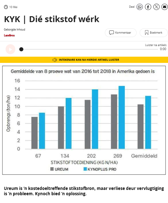 Navorsing bevestig dat ureumvervlugtiging steeds ‘n groot uitdaging is onder verskeie omstandighede. Kynoplus Pro® bied ‘n bewese oplossing om verliese te verminder en opbrengste te maksimeer. Moenie verliese aanvaar as ‘n gegewe nie—Kynoplus Pro® is die sleutel tot doeltreffende stikstofbenutting en verbeterde winsgewendheid!